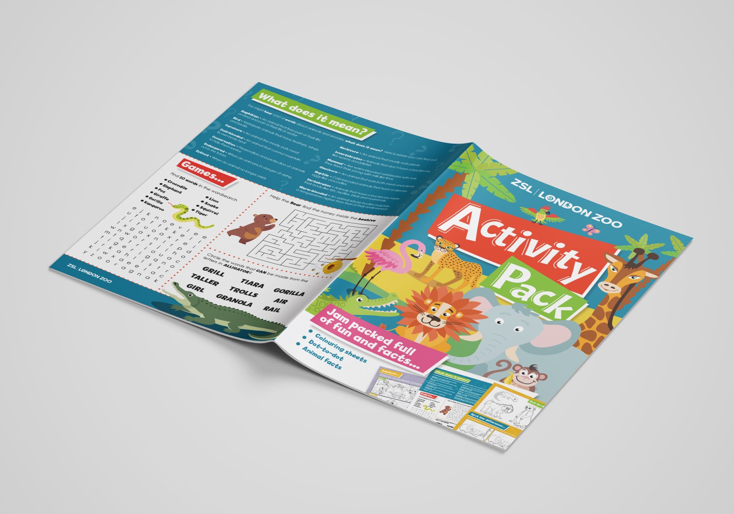 Using animals seen at the zoo was our starting point to guide children through a path of learning which helped them understand the need to take care and nurture nature always. The book was developed as part colouring and part graphical renders of fully finished pieces to encourage and engage the children’s creative side. From our research the addition of activities to further engage development was implemented in order to enjoy a fully finished educational book from start to finish whilst learning along the way.